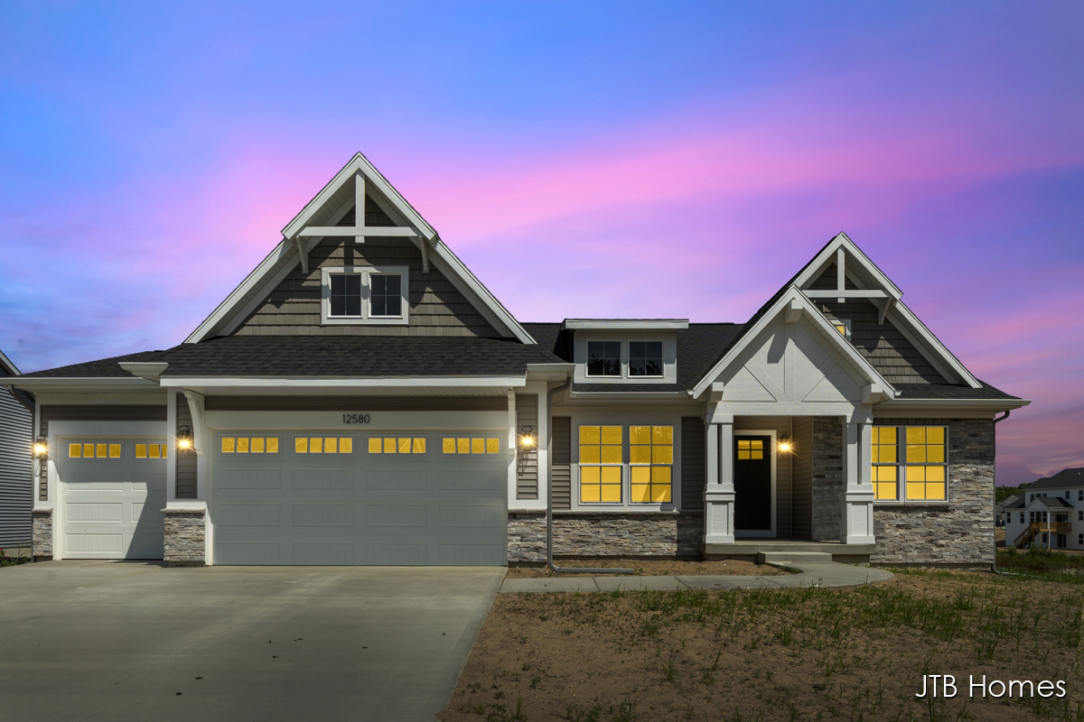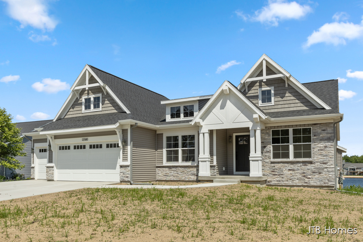 JTB Homes presents one of our most popular ranch floor plans – The Elmwood. This home is located in the very popular Stonewater community in Grand Haven. This ranch floor plan features an open kitchen with solid surface countertops, an over-sized center island, and completed with a high-end stainless steel appliance package. Directly off the kitchen is a nook area opening to the living room. The living room features a custom gas log fireplace as well as vaulted ceilings throughout the main floor living area. The primary suite is located away from the other 2 bedrooms and comes complete with dual bowl vanity and built-ins. Want more? The walkout is unfinished with loads of future opportunity for another bedroom, huge recreational room, and rough-in plumbing for bath. This home is complete and move-in ready.