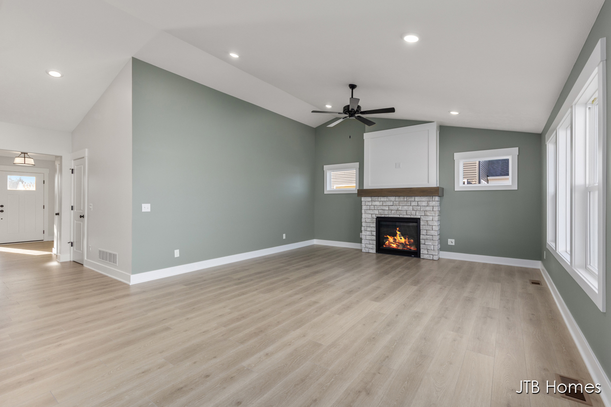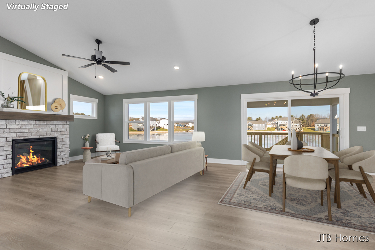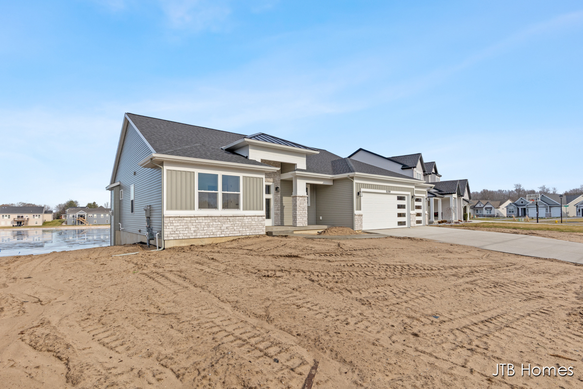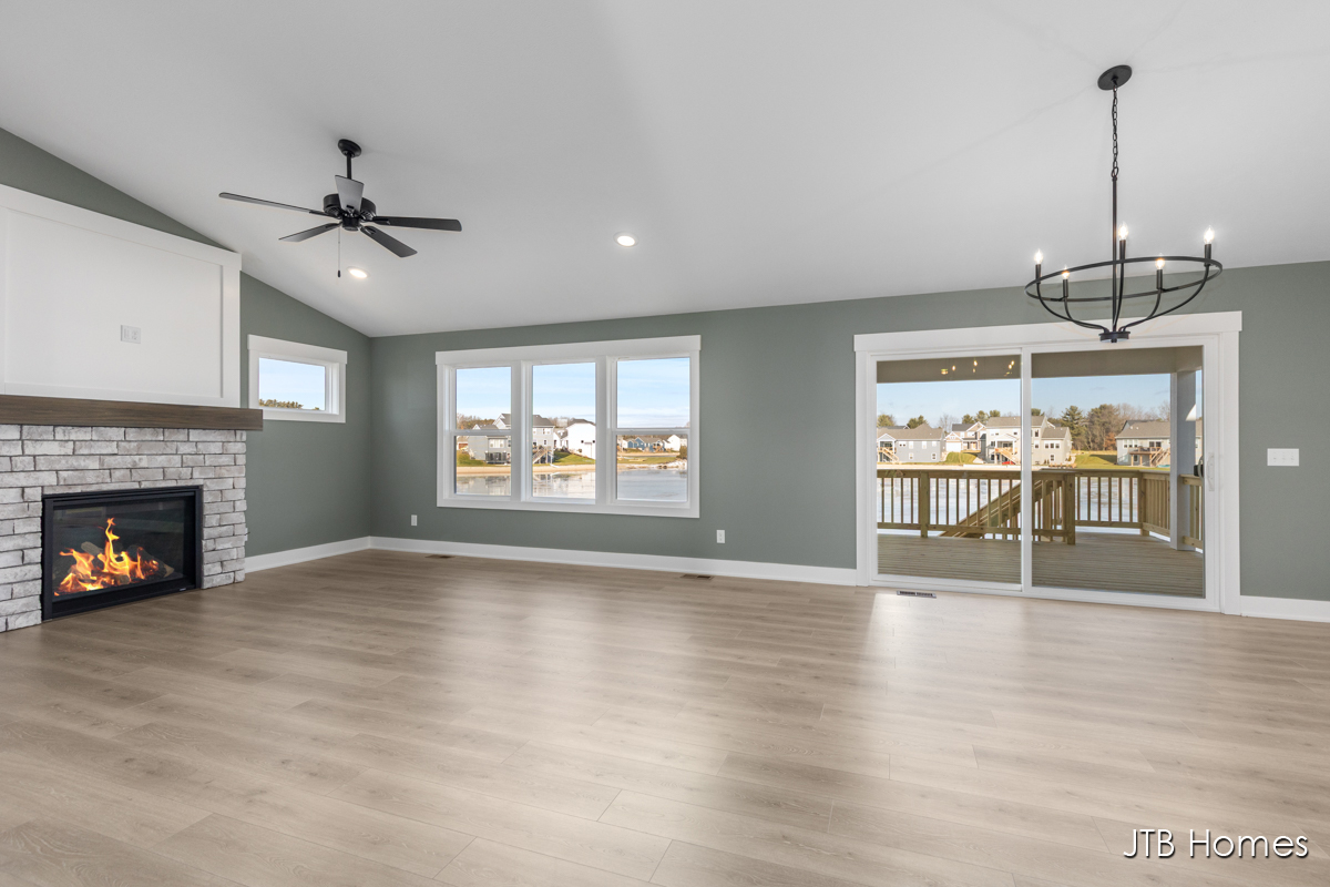 JTB Homes presents our Oakwood floor plan ranch home alongside a large water lot in the Stonewater community. This home features an open and airy floor plan with a large kitchen, with a center isle and spacious butler pantry. The kitchen and dining area open up to the living room with a gas log fireplace. You’ll enjoy the large covered deck off the dining area. The main floor also features a spacious primary bedroom and a large suite with a ceramic tile shower and walk-in closet. The walkout basement is pre-plumbed for a future bathroom with plenty of storage.
